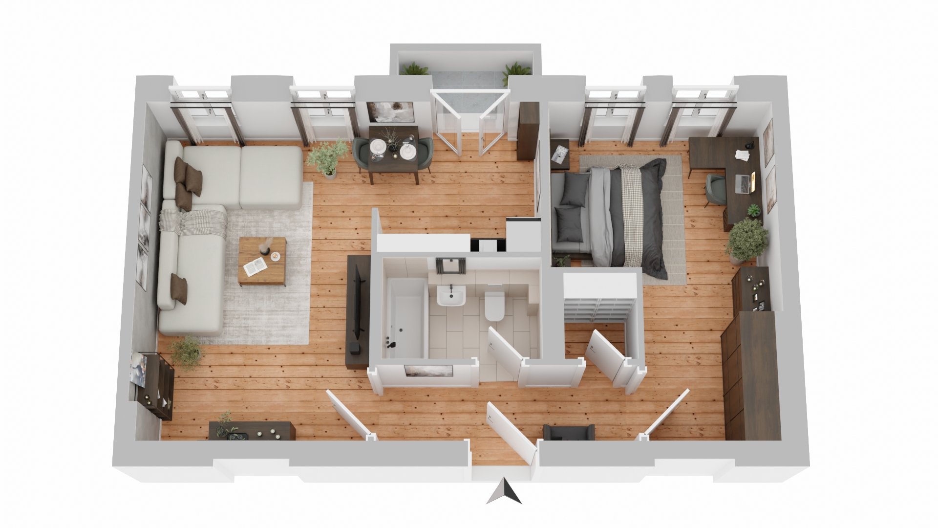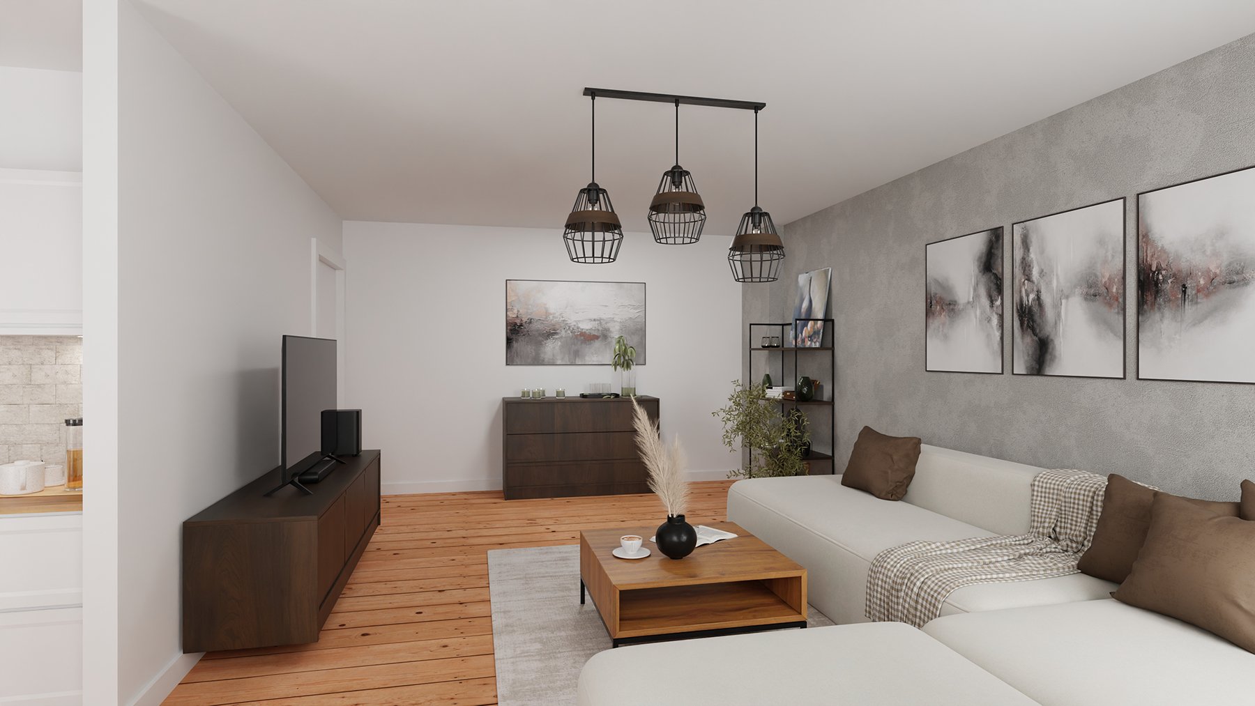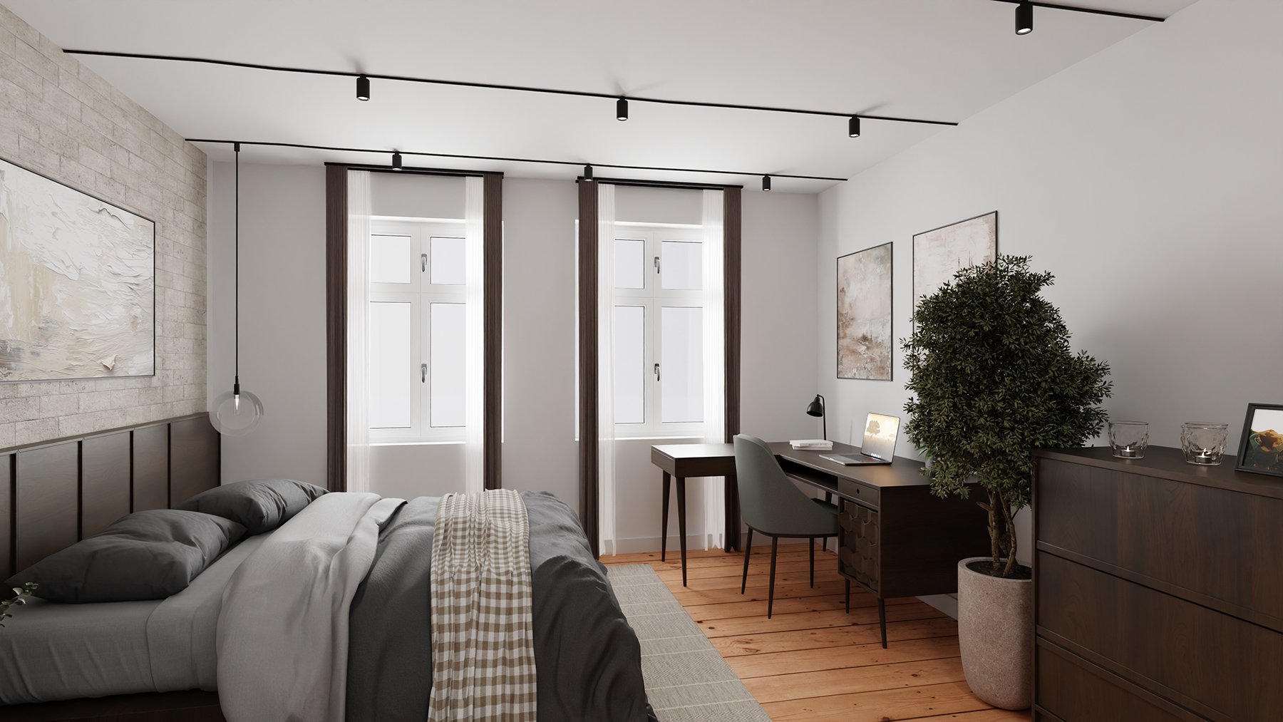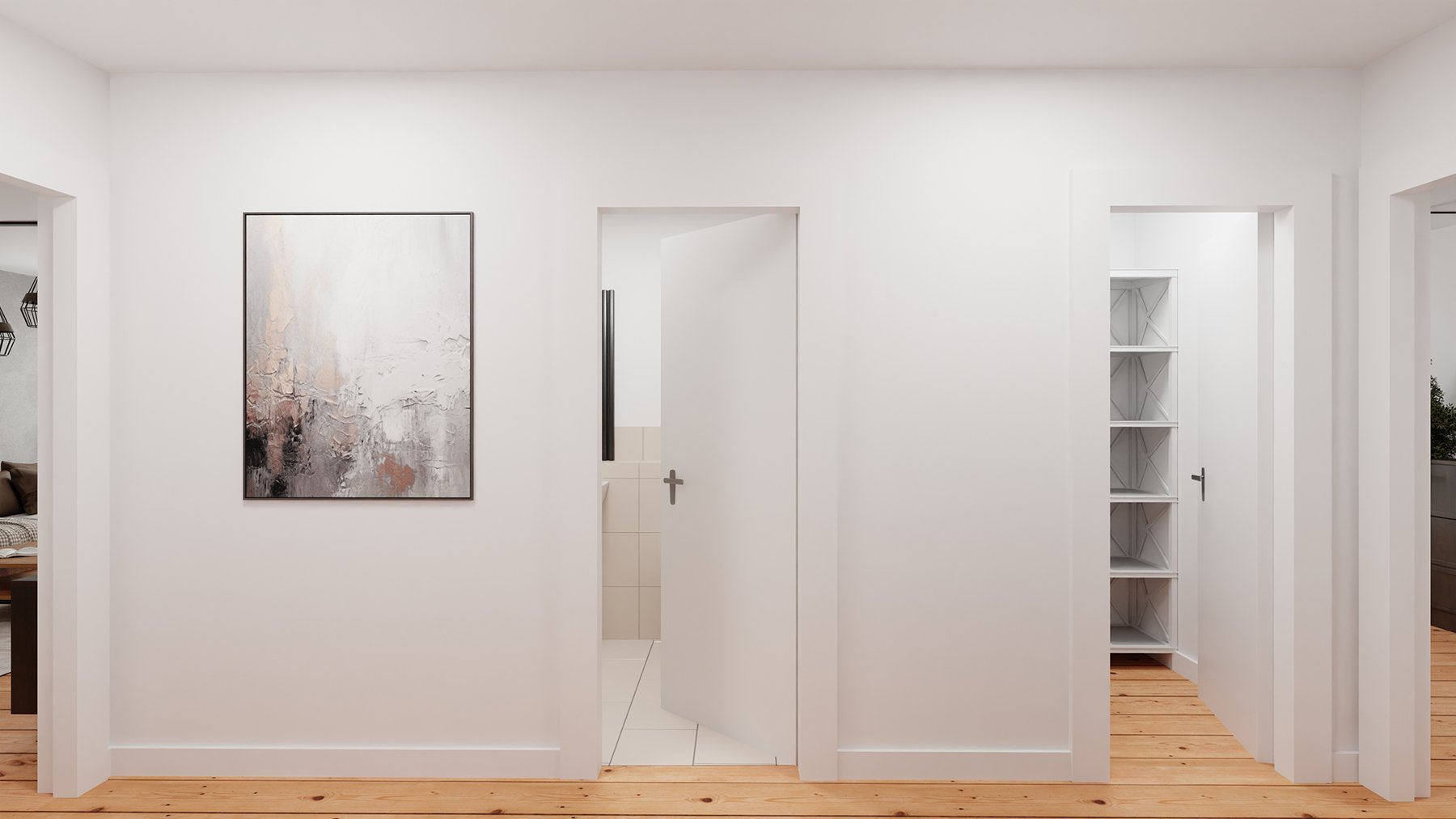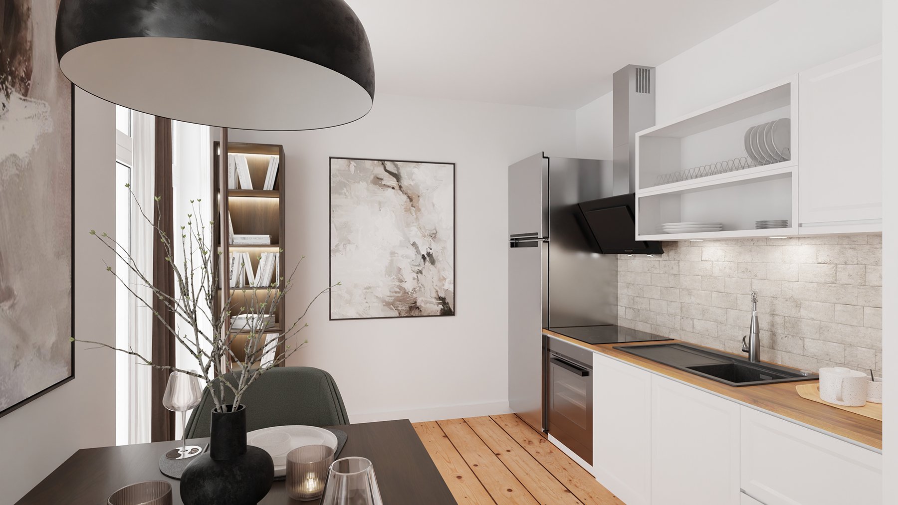 In einer lebendigen Stadt, wie es Berlin ist, tut es gut, in eine ruhevolle und bequeme Wohnung nach Hause zu kommen. Und noch mehr, wenn sie ein wenig über allem liegt. Die Wohnung trägt mit ihrer klaren Aufteilung, den honigfarbenen Dielenböden, den historischen Türen und dem Deckenstuck zur Entspannung bei. Das Besondere an dieser Wohnung ist der großzügige aber dennoch sehr effiziente Grundriss.