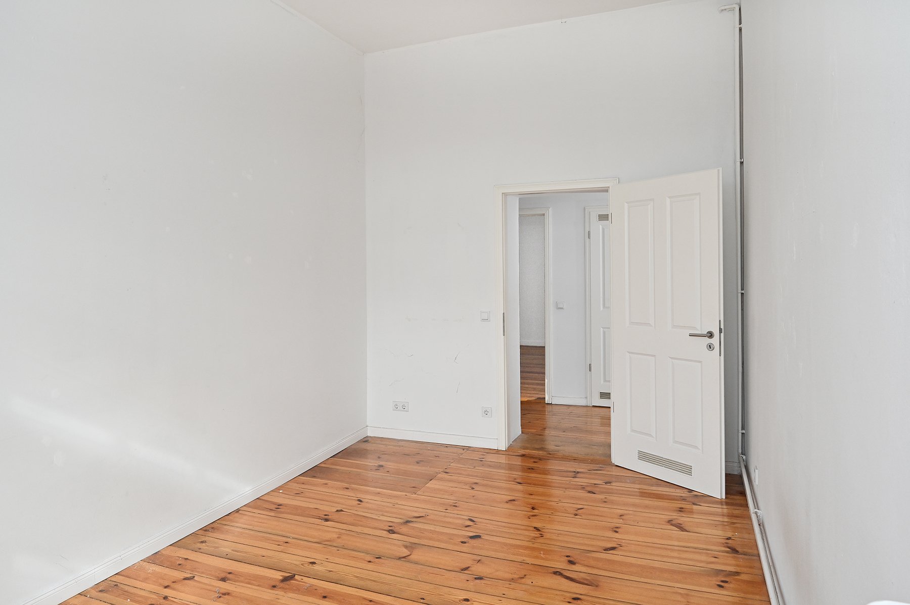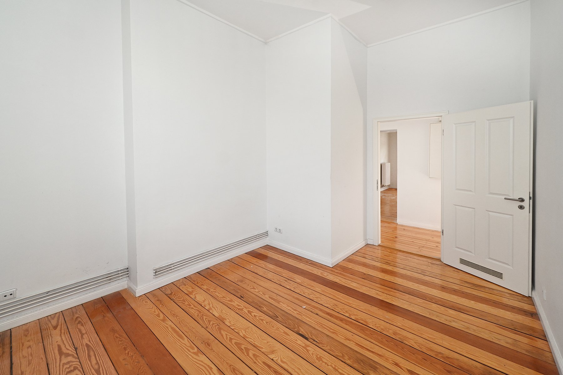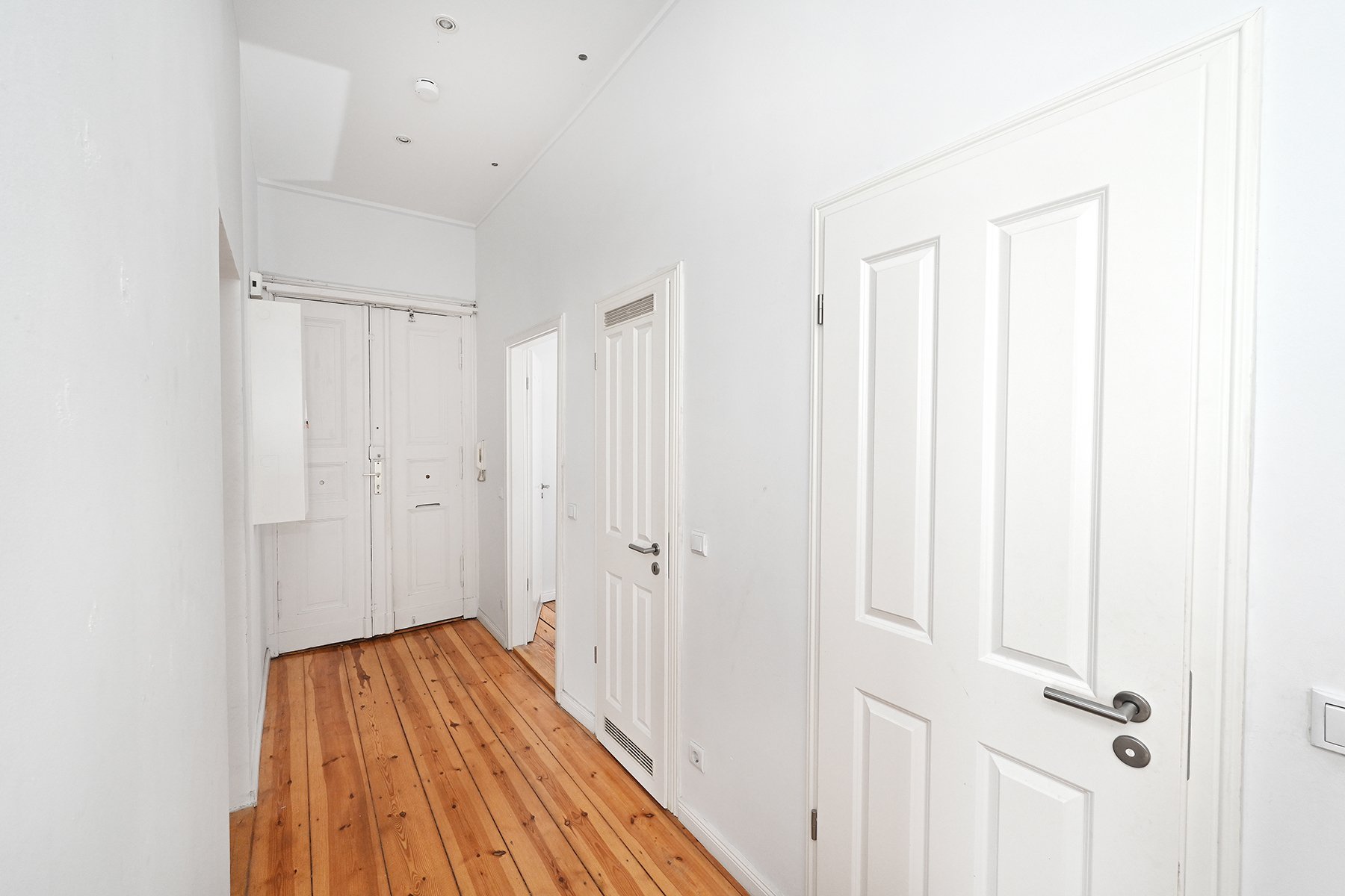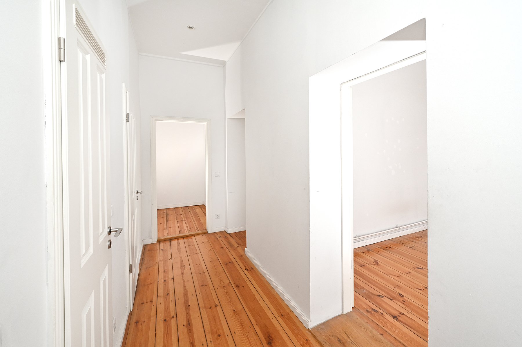 Die großzügig angelegte Wohnung befindet sich im vierten Obergeschoss. Die 101 Quadratmeter sind auf vier Zimmer, eine geräumige Tageslichtküche, ein Tageslichtbad, zwei praktische Flure und eine Abstellkammer aufgeteilt. Die beiden Flure sind zueinander leicht versetzt, erzeugen somit eine kleine überraschende weitere Sichtachse und bieten zusätzlich Stellfläche z.B. für Bücherregale. Jedes Zimmer ist separat begehbar.