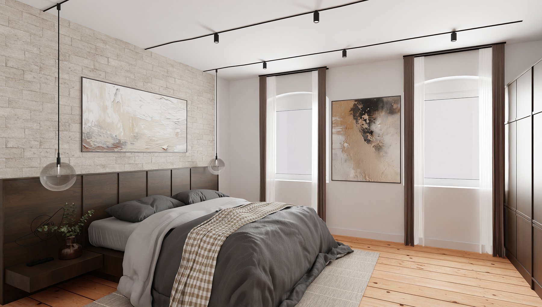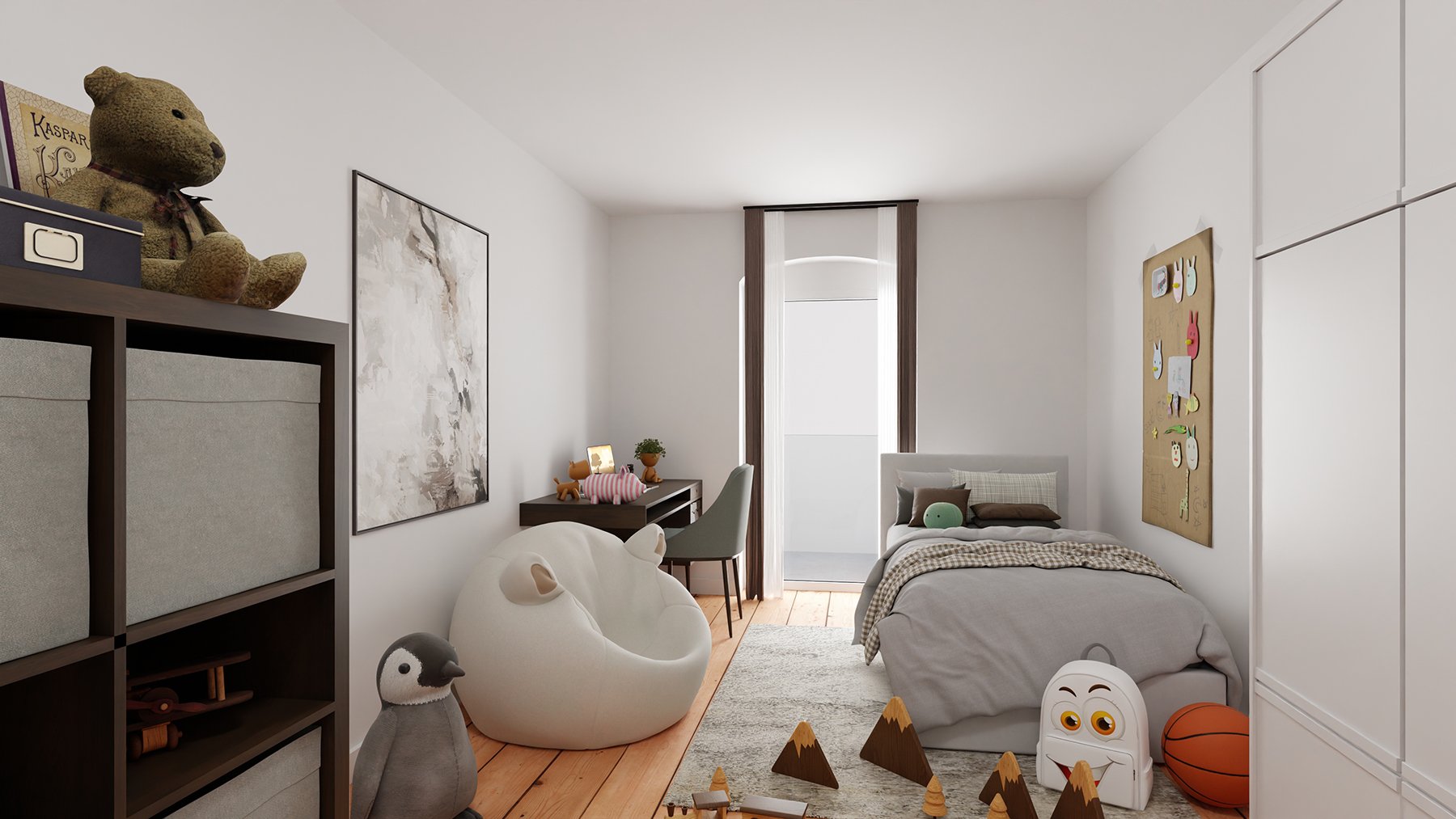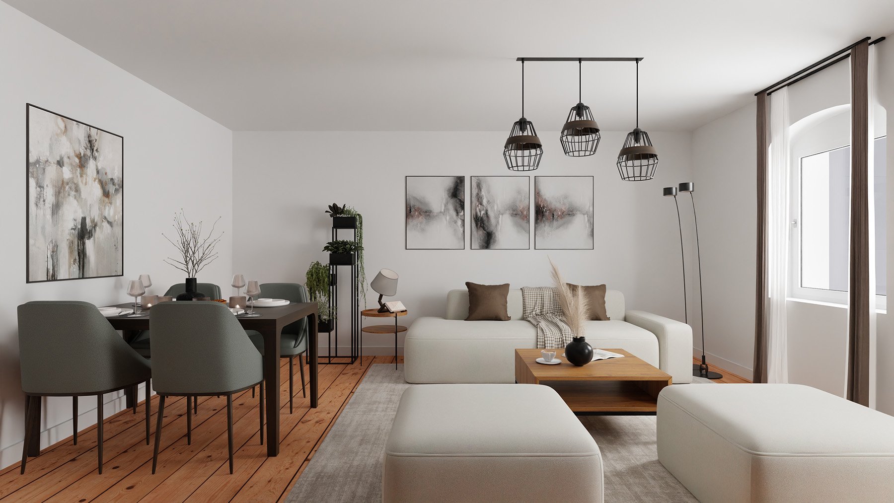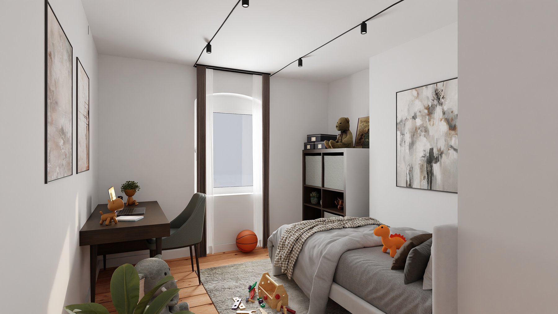 Die großzügig angelegte Wohnung befindet sich im vierten Obergeschoss. Die 101 Quadratmeter sind auf vier Zimmer, eine geräumige Tageslichtküche, ein Tageslichtbad, zwei praktische Flure und eine Abstellkammer aufgeteilt. Die beiden Flure sind zueinander leicht versetzt, erzeugen somit eine kleine überraschende weitere Sichtachse und bieten zusätzlich Stellfläche z.B. für Bücherregale. Jedes Zimmer ist separat begehbar.